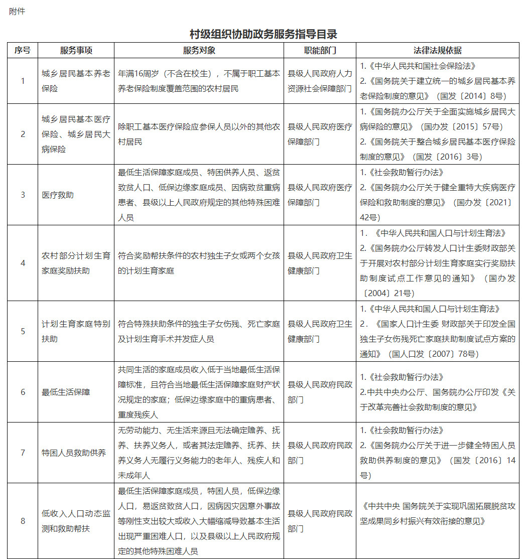 (一)依法協(xié)助辦理政務(wù)服務(wù)。指導(dǎo)村級組織根據(jù)協(xié)助政務(wù)服務(wù)目錄,結(jié)合實際細化辦理程序和辦法并公開,做好政務(wù)政策法規(guī)宣傳、信息發(fā)布、咨詢反饋等工作。協(xié)助落實重點群體走訪、監(jiān)測和救助幫扶等政策,做好基層治理數(shù)據(jù)采集校核工作。村委會要健全下屬公共衛(wèi)生委員會,深入開展愛國衛(wèi)生運動,協(xié)助做好重大疫情及突發(fā)公共衛(wèi)生事件、計劃生育特殊家庭扶助關(guān)懷等工作;健全下屬治安保衛(wèi)委員會和人民調(diào)解委員會,協(xié)助完善群防群治機制,加強民間糾紛排查調(diào)處;健全婦女和兒童工作委員會,協(xié)助做好未成年人保護和困境兒童、留守婦女關(guān)愛服務(wù),落實家暴性侵等違法犯罪行為發(fā)現(xiàn)報告和家庭監(jiān)護監(jiān)督制度。
